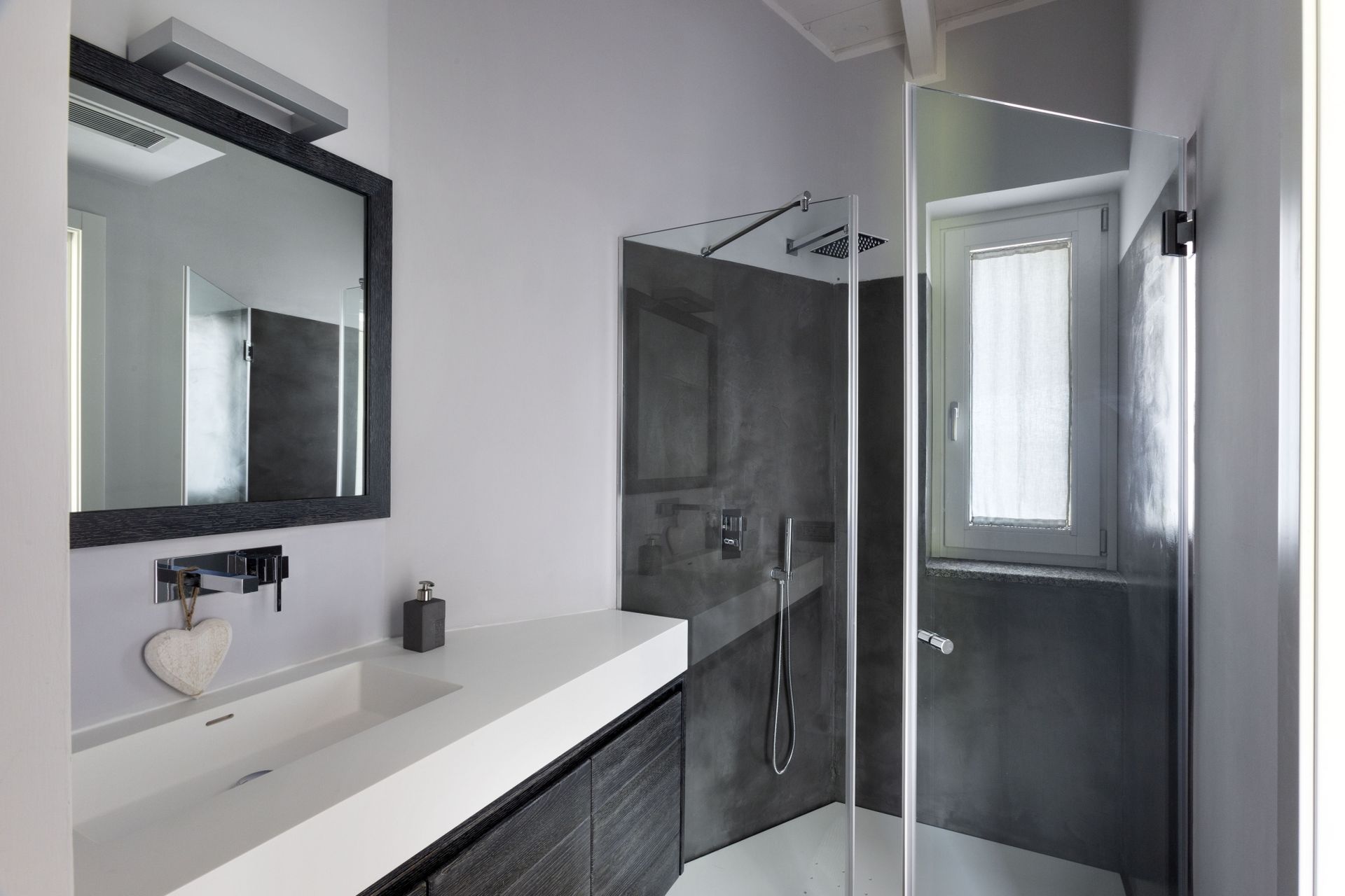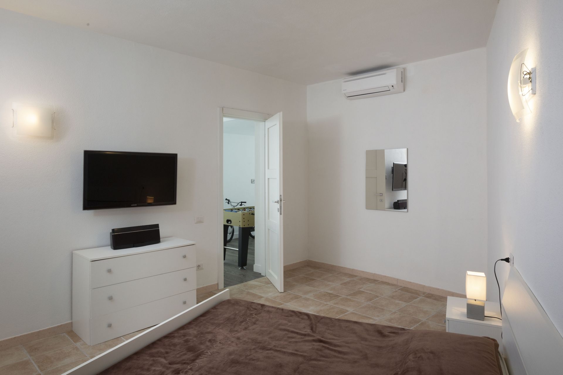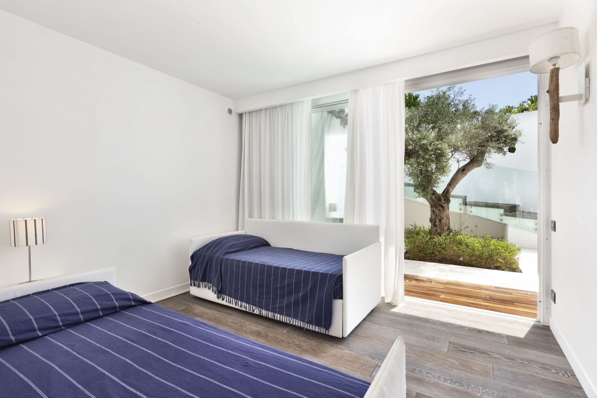 The master bedroom, located on the upper floor in the outermost peninsular block, is enriched by a splendid sea view and integrated with a single bed for families with children. The relative ensuite service is composed of two sections that make its use more functional for the occupants. The bedroom can be reached from the veranda on the upper floor both via the living area and via the stairs that start from the front garden and the rear courtyard.