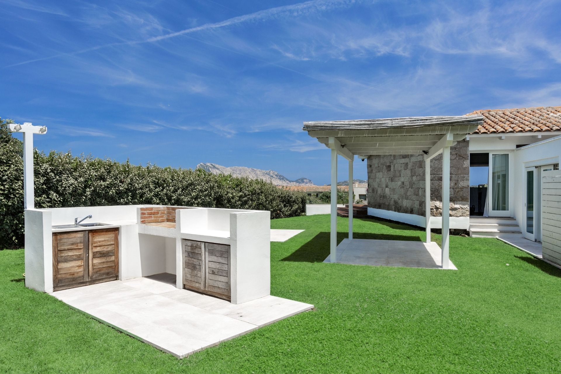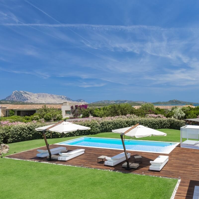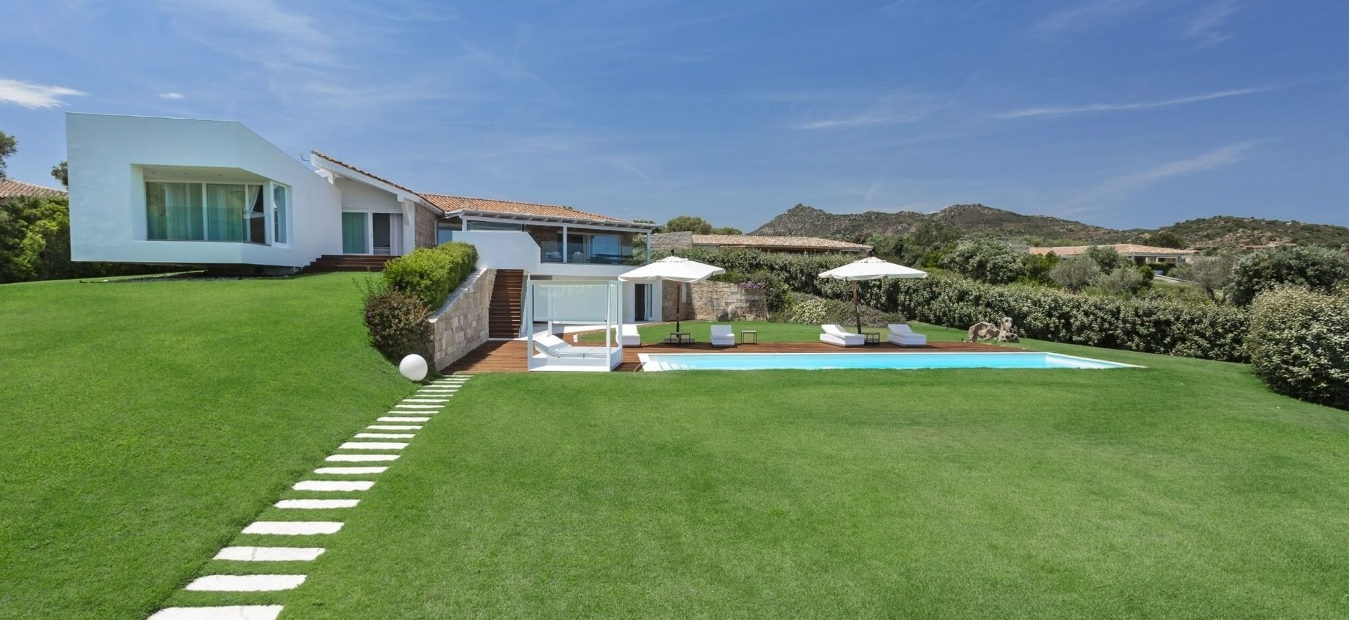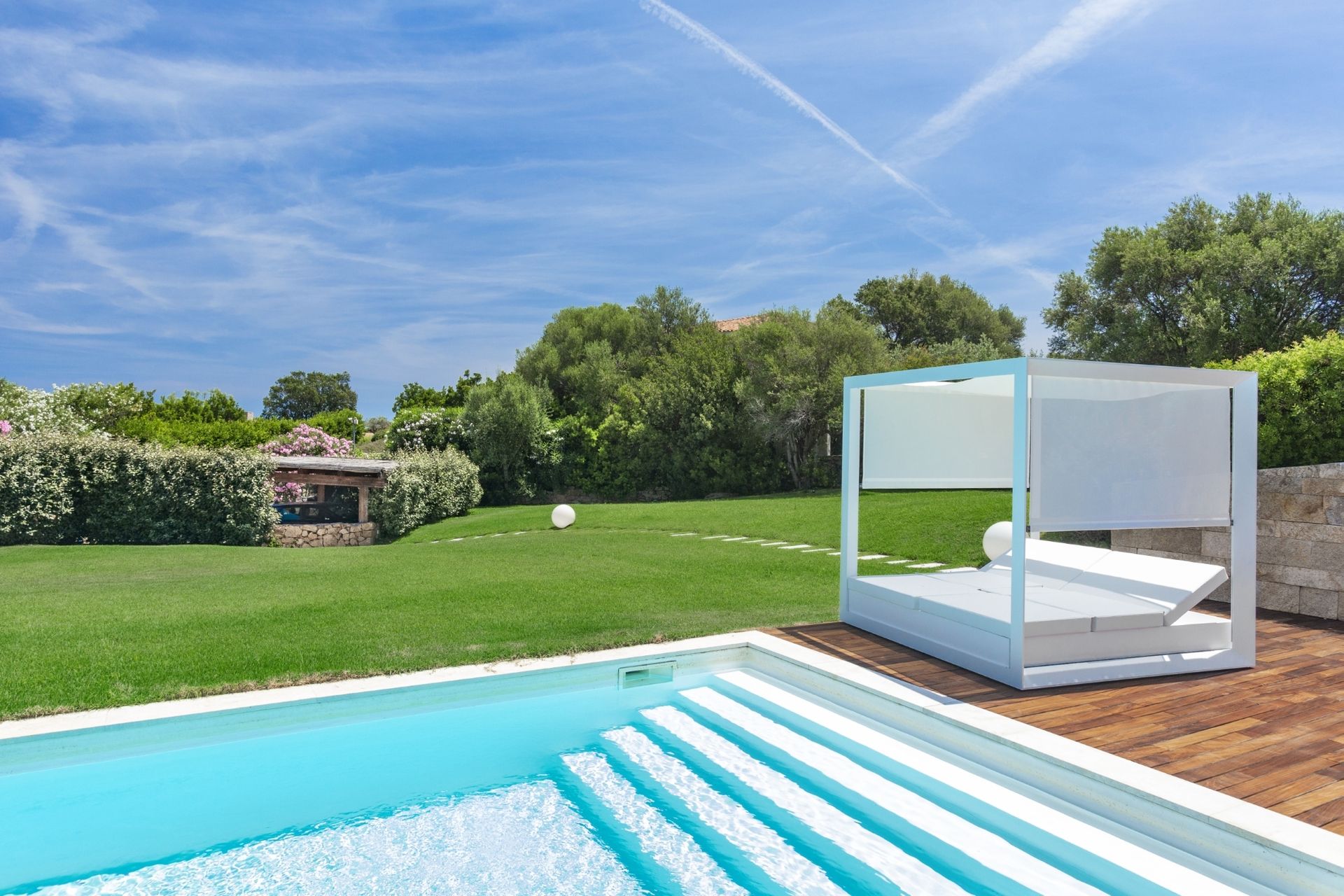 Upon entering the property, one cannot help but notice the bright green colours of its garden, which create a strong contrast with the blue of the swimming pool and the luminescent white of the completely renovated outdoor furniture and its walls, forming a perfect combination between the architectural style of the villas of the American east coast and the traditional style typical of Gallura, with its stones set into the external walls.