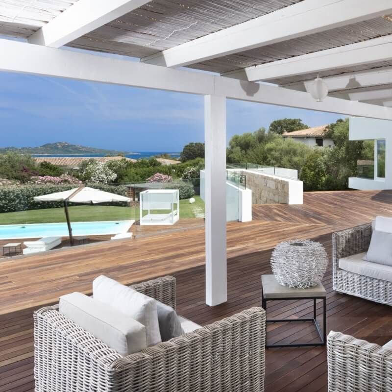 that surrounds the entire floor, designed and furnished for pleasant outdoor lunches and dinners and quiet moments of relaxation in the mild climate of Sardinia, opening onto a splendid